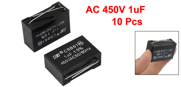 Product Name Motor Capacitor Housing Material Plastic Dielectric Material Polypropylene Film Model CBB61 Capacitance 1uF Tolerance ±5% Rated Voltage 450V AC Frequency 50/60Hz Lead Spacing(Approx.) 31mm/1.2'' Lead Size 26 x 0.8mm/1'' x 0.03"(L*D) Overall Size 36 x 15 x 50mm/1.4'' x 0.6'' x 2'' (L*W*H) Color Black Weight 148g Package Content 10 x Motor Capacitor - Reviews