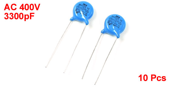 Product Name Ceramic Disc Capacitors Rated Voltage AC 400V Capacitance 3300PF Body Size 10 x 4mm/ 0.39" x 0.15" (D*T) Lead Space 7mm/ 0.2" Lead Length 25mm/ 0.9" Main Color Blue, Silver Tone Weight 20g Package Content 10 Pcs x Ceramic Disc Capacitors - Reviews