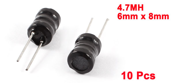 Product Name Inductor Material UL-polyolefin, Metal Inductance 4.7MH Body Size 6 x 8mm / 0.236" x 0.31"(D*H) Lead Diameter 0.5mm / 0.196" Pitch 3mm/ 0.118" Color Black, Silver Tone Weight 11g Package Content 10 x Inductors - Reviews