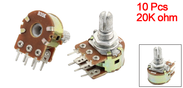 Product Name Potentiometer Resistance Value 20K ohm Power AC 250V Adjustment Type Adjustment Top Type Dual Linear(Type B) Features Knurled Shaft Shaft Diameter 5mm / 0.2" Shaft Length 8mm / 0.31" Mounting Thread Diameter 6.8mm / 0.26" Base Size 16 x10mm / 0.63" x 0.39"(D*H) Total Height 27mm/1.06" Material Metal, Electronic Parts,Carbon Film Net Weight 64g Package 10 x Potentiometer - Reviews
