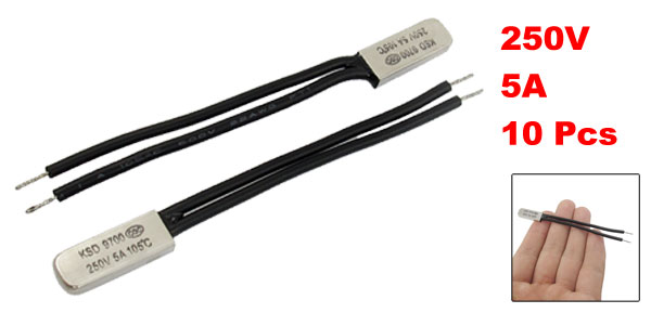 Product Name Temperature Control Switch Model.No KSD9700 Material Plastic, Bimetal Contact NC(Normal Close) Rated Voltage 250V Current 5A Max Rated Disconnection Temperature 105C Color Silver Tone, Black Cable Length 6.5cm/ 2.6" Head Dimension 20 x 8 x 3mm / 0.79" x 0.31" x 0.12"(L*W*T) Net Weight 33g Package Content 10 x Temperature Control Switch - Reviews