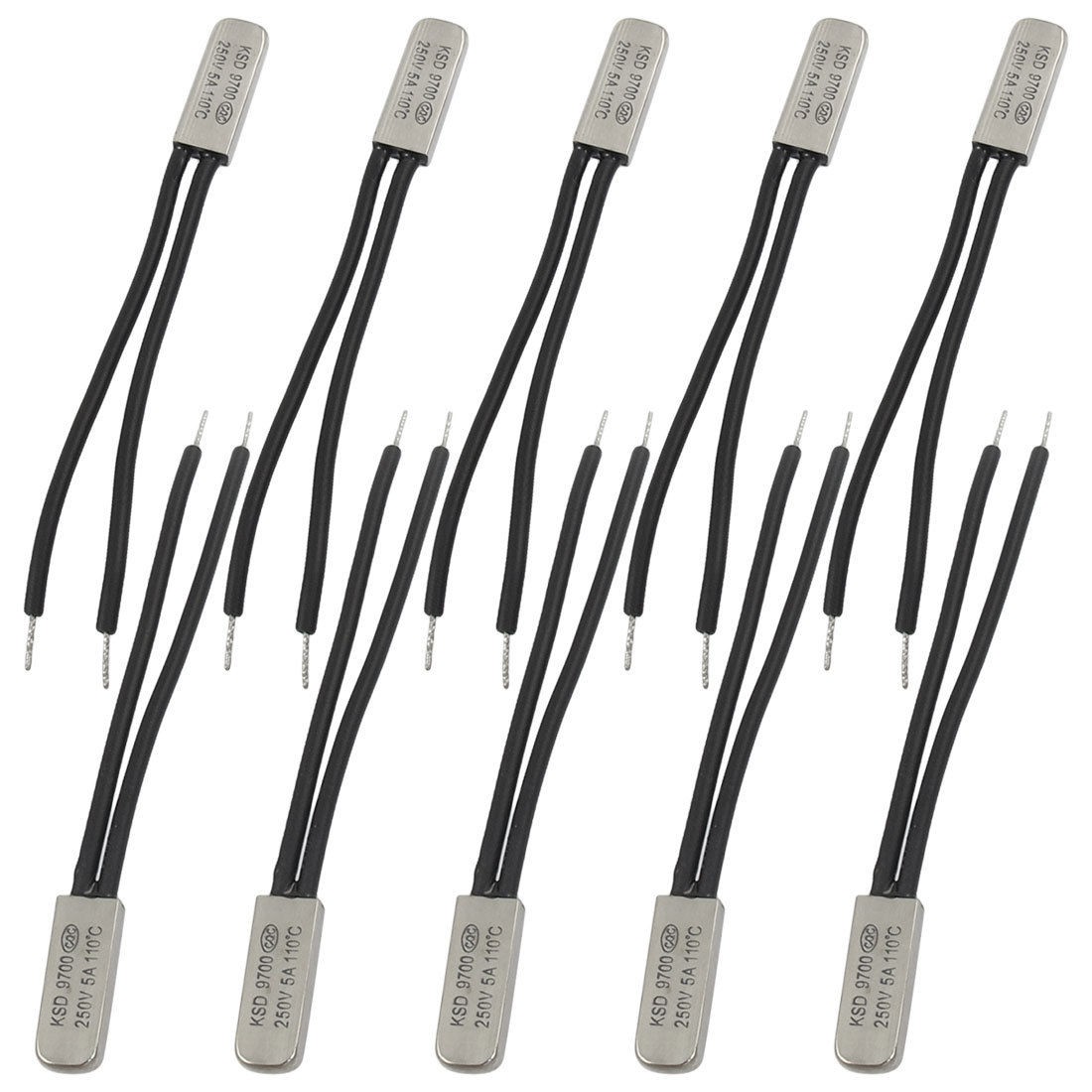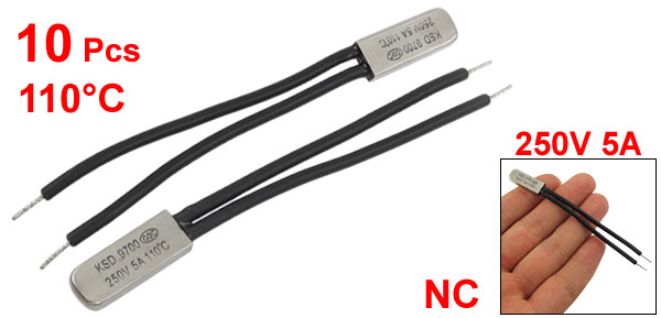 Product Name Temperature Control Switch Model.No KSD9700 Material Plastic, Bimetal Contact NC(Normal Close) Rated Voltage 250V Current 5A Max Rated Disconnection Temperature 110C Color Silver Tone, Black Cable Length 6.5cm/ 2.6" Head Dimension 20 x 8 x 3mm / 0.79" x 0.31" x 0.12"(L*W*T) Net Weight 33g Package Content 10 x Temperature Control Switch - Reviews