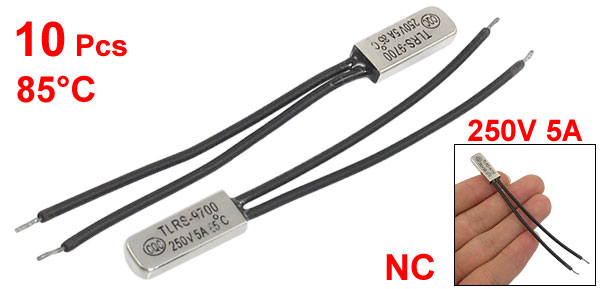 Product Name Temperature Control Switch Model.No TLRS9700 Material Plastic, Bimetal Contact NC(Normal Close) Rated Voltage 250V Current 5A Max Rated Disconnection Temperature 85C Color Silver Tone, Black Cable Length 6.5cm/ 2.6" Head Dimension 20 x 8 x 3mm / 0.79" x 0.31" x 0.12"(L*W*T) Net Weight 35g Package Content 10 x Temperature Control Switch - Reviews