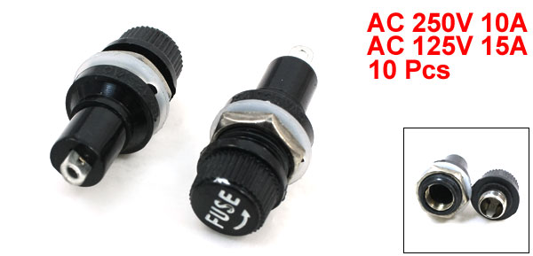 Item Name Panel Mounted Fuse Holder Fit for 5 x 20mm / 0.2" x 0.8" Fuses Maxi. Withstand 10A 250VAC 15A 125VAC Material Plastic and Metal Color Black Size 1.6 x 4cm / 0.63" x 1.6" ( Inner Diameter x Length) Weight 60g Package Content 10 x Panel Mount Fuse Holder - Reviews