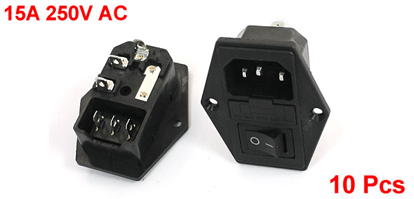 Product Name Power Socket Plug Type IEC320 C14 Voltage & Current 15A 250V AC Button Color Black Rocker Switch Type 3Pin SPDT Fit Fuse Size 5 x 20mm/ 0.2" x 0.79" (L*W) Total Socket Size 5.8 x 4.8 x 3.3cm/2.3" x 1.9" x 1.3"(L*W*T) Mount Size 4.8 x 2.7cm/1.9" x 1"(L*W) Material (External) Plastic, Metal Main Color Silver Tone, Black Weight 250g Package Content 10 x Power Socket w Fuse Holder w Rocker Switch