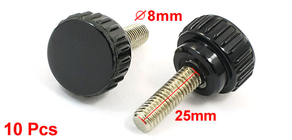 Product Name Knurled Knob Type Screw On Head Diameter 26mm / 1" Thread Length 25mm / 0.9" Thread Diameter 8mm / 0.3" Total Height 43mm /1.7" Material Metal , Plastic Color Silver Tone, Black Weight 246g Package Content 10 x Knurled Knob - Reviews