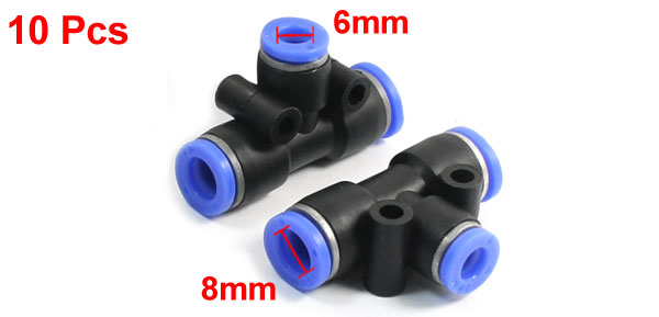 10 Pcs Black Blue 8mm to 6mm Tee Union Pneumatic Push In Fittings Quick Couplers