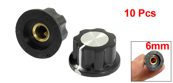 Product Name Rotary Knob Material Plastic, Metal Color Black, Silver Tone Fit for Shaft Hole Dia. 6mm/ 15/64" Knob Inner Dia 15mm/ 0.6" Knob Top Diameter 19mm/0.7" Overall Size 23 x 12mm/ 0.9" x 0.5"(D*H) Weight 55g Package Included 10 x Potentiometer Rotary Knobs - Reviews