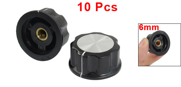 Product Name Rotary Knob Material Plastic, Metal Color Black, Silver Tone Fit for Shaft Hole Dia. 6mm/ 15/64" Knob Inner Dia 25mm/ 1" Knob Top Diameter 30mm/1.24" Overall Size 34 x 16mm/ 1.3" x 0.6"(D*H) Weight 121g Package Included 10 x Potentiometer Rotary Knobs - Reviews