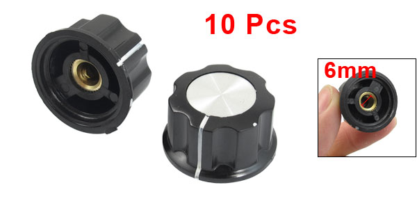Product Name Rotary Knob Material Plastic, Metal Color Black, Silver Tone Fit for Shaft Hole Dia. 6mm/ 15/64" Knob Inner Dia 22mm/ 0.86" Knob Top Diameter 23mm /0.9" Overall Size 26 x 15mm/ 1" x 0.6"(D*H) Weight 68g Package Included 10 x Potentiometer Rotary Knobs - Reviews