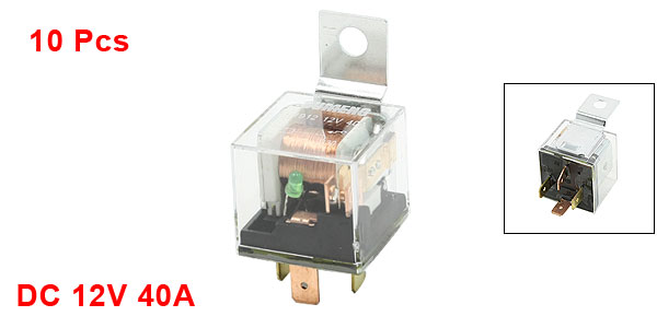 Product Name Car Relay Model No. JD1912 Rated Current 40A Rated Voltage DC 12V Contact Type 1NC(SPST) Pin Number 4 Indicator Light Color Green Size 2.8 x 2.8 x 2.5cm / 1.1" x 1.1" x 1" (L*W*T) Material(External) Plastic, Metal Main Color Clear, Black Weight 360g Package Content 10 x Car Relay