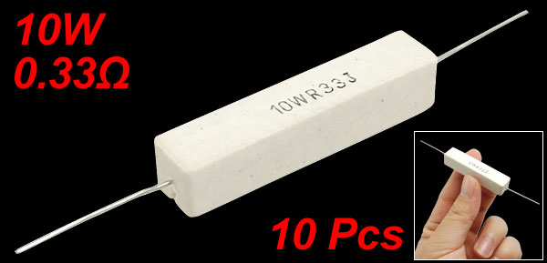 Product Name Cement Resistor Body Material Ceramic, Cement Power 10W Resistance 0.33Ω Tolerance ±5% Body Size (Approx.) 49 x 10 x 9mm/ 1.9" x 0.39" x 0.35" (L*W*H) Lead Diameter (Approx.) 0.8mm/ 0.031" Lead Length (Approx.) 27mm/ 1.06"(Max.), 23mm/ 0.9" (Min.) Color White Weight 106g Package Content 10 x Cement Resistors - Reviews