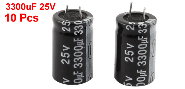 Product Name Electrolytic Capacitor Maximum Temperature -40+105C Voltage 25V Capacitance 3300uF Total Size(Approx.) 25 x 16mm/ 1" x 0.67" (L*D) Lead Space 6.5mm/ 0.26" Lead Length 13mm/ 0.25" External Material Aluminum Main Color Silver Tone, Black Weight 71g Package Content 10 Pcs x Electrolytic Capacitors - Reviews