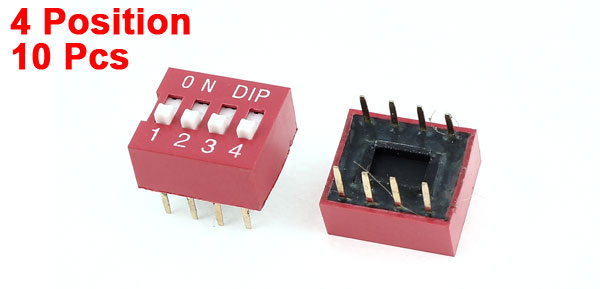 Product Name DIP Switch Type Slide Type Poles 4 Position 8Pin (2Row) Pitch 2.54mm Non-Switching Rating 100mA DC 50V Switching Rating 100mA DC 24V Dimension 12 x 10 x 10mm/ 0.47" x 0.39" x 0.39"(L*W*H) Material Plastic, Electric Parts Main Color Red, Gold Tone,White Weight 11g Package Content 10 Pcs x DIP Switches - Reviews
