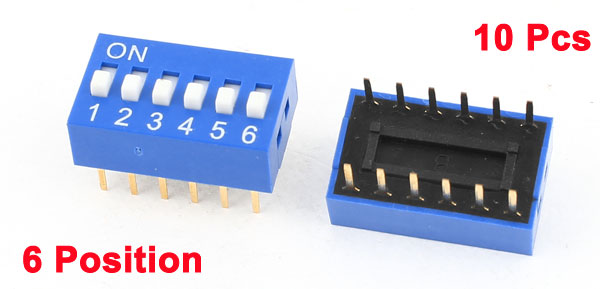 Product Name DIP Switch Type Slide Type Poles 6 Position 12Pin (2Row) Pitch 2.54mm Non-Switching Rating 100mA DC 50V Switching Rating 100mA DC 24V Dimension 17 x 10 x 10mm/ 0.67" x 0.39" x 0.39"(L*W*H) Material Plastic, Electric Parts Main Color Green, Gold Tone,White Weight 17g Package Content 10 Pcs x DIP Switches  - Reviews