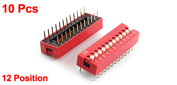 Product Name DIP Switch Type Slide Type Poles 12 Position 24Pin (2Row) Pitch 2.54mm Non-Switching Rating 100mA DC 50V Switching Rating 100mA DC 24V Dimension 32 x 10 x 10mm/ 1.2" x 0.39" x 0.39"(L*W*H) Material Plastic, Electric Parts Main Color Red, Gold Tone,White Weight 34g Package Content 10 Pcs x DIP Switches - Reviews