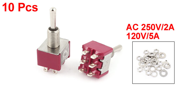 Main Color Red, Silver Tone Product Name Toggle Switch Brand DMiotech Net Weight 55g Country of Manufacture CHINA Package Content 10 x Toggle Switch Main Body Size 18 x 11 x 10mm / 0.7" x 0.43" x 0.4" (L*W*H) Rating AC 250V/2A 120V/5A Total Height 32mm / 1.2" Type DPDT ON-OFF-ON Material Metal, Plastic Mounting Thread Diameter 6mm / 0.24" - Reviews