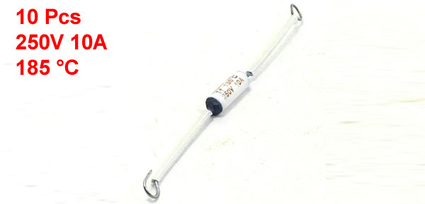Product Name Thermal Fuse Rating 250V 10A Cutoff Temperature 185 °C Fuse Size 6 x 15 mm / 0.24" x 0.59" (D*L) Total Length 9cm / 3.5" Main Material Ceramic, Metal Color White, Blue Weight 11g Package 10 x Thermal Fuse - Reviews