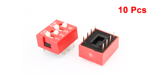 10 Pcs Electronic Component 4 Ways 2 Rows Slide Type ON/OFF DIP Switch Red