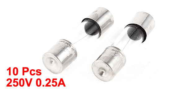 Product Name Glass Tube Fuses Fuction Fast Blow Rated Voltage 250V Rated Current 0.25A Specification 5 x 20mm Diameter 5mm / 0.2" Length 20mm / 0.8" Material Glass Color Clear, Silver Tone Weight 7g Package 10 x Glass Tube Fuses - Reviews