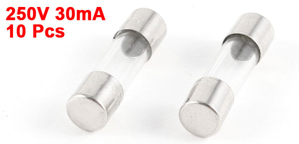 Product Name Glass Tube Fuses Fuction Fast Blow Rated Voltage 250V Rated Current 30mA Specification 5 x 20mm Diameter 5mm / 0.2" Length 20mm / 0.8" Material Glass Color Clear, Silver Tone Weight 10g Package 10 x Glass Tube Fuses - Reviews