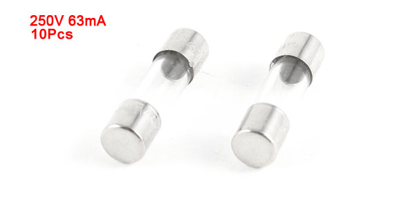 Product Name Glass Tube Fuses Fuction Fast Blow Rated Voltage 250V Rated Current 63mA Specification 5 x 20mm Diameter 5mm / 0.2" Length 20mm / 0.8" Material Glass Color Clear, Silver Tone Weight 9g Package 10 x Glass Tube Fuses - Reviews