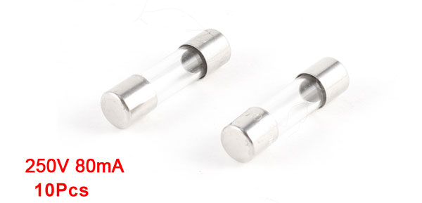 Product Name Glass Tube Fuses Fuction Fast Blow Rated Voltage 250V Rated Current 80mA Specification 5 x 20mm Diameter 5mm / 0.2" Length 20mm / 0.8" Material Glass Color Clear, Silver Tone Weight 9g Package 10 x Glass Tube Fuses - Reviews