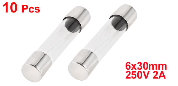 Product Name Glass Tube Fuses Fuction Fast Blow Rated Voltage 250V Rated Current 2A Specification 6 x 30mm Diameter 6mm / 0.24" Length 30mm / 1.2" Material Glass, Metal Color Clear, Silver Tone Weight 11g Package 10 x Glass Tube Fuses - Reviews