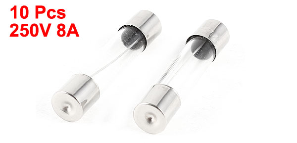 Product Name Glass Tube Fuses Fuction Fast Blow Rated Voltage 250V Rated Current 8A Specification 6 x 30mm Diameter 6mm / 0.24" Length 30mm / 1.2" Material Glass, Metal Color Clear, Silver Tone Weight 11g Package 10 x Glass Tube Fuses - Reviews