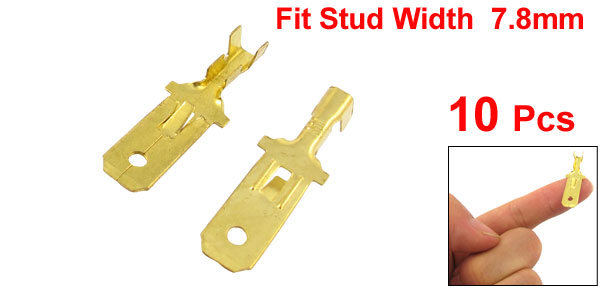 Product Name Male Spade Terminal Connector Material Metal Fit Stud Width 7.8mm / 5/16“ Total Size 30 x 8 x 4mm / 1.2" x 0.31" x 0.16"(L*W*H) Fit Cable Diameter 2.7mm /0.1" Main Color Gold Tone Weight 11g Package Content 10 x Female Spade Terminal Connector - Reviews