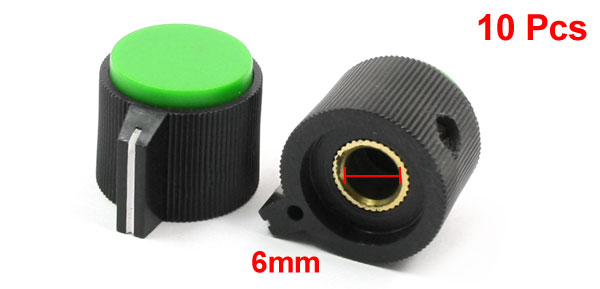 Product Name Potentiometer Knob Material Plastic, Metal Color Black, Green Fit for Shaft Hole Dia. 6mm/ 15/64" Knob Bottom Dia 19mm/0.7" Knob Top Diameter 19mm/0.7" Overall Size 23 x 16mm/ 0.9" x 0.63"(D*H) Weight 54g Package Included 10 x Potentiometer Rotary Knobs - Reviews