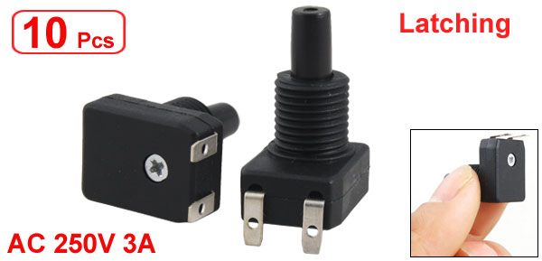 Product Name Switch Action Type Latching Terminal Number 2 Pin Terminal Type Horizontal(Downward) Rating Voltage AC 250V 3A Total Size(Each One) 19 x 13 x 27mm/ 0.7" x 0.5" x 1.06" (L*W*H) Thread Diameter 10mm/ 0.39" Color Black Material Plastic & Metal Total Weight 32g Package Content 10 x Lamp Canopy Switch - Reviews