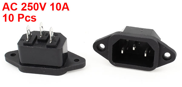 Product Name Power Inlet Connector Type 3 Pin IEC320 C14 Voltage / Current AC 250V 10A Material Metal, Plastic Color Black Overall Size 50 x 28 x 20mm/ 2" x 1.1" x 0.8" (L*W*T) Mounted Hole 40 x 4mm/ 1.6" x 0.16"(Distance*Dia) Net Weight 79g Package Content 10 x Power Inlet Connector - Reviews