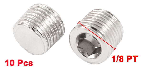 Product Name Hex Head Pipe Plug Color Silver Tone Material Metal, Chrome Plated Thread Diameter 9.5mm/ 1/8 PT Height 7.5mm/ 0.3" Hex Side to Side Diatance 5.5mm/ 0.22" Net Weight 20g Package Content 10 Pcs x Hex Head Pipe Plug - Reviews