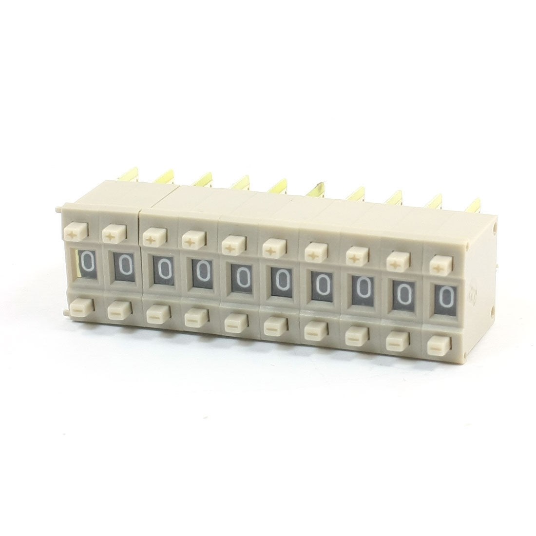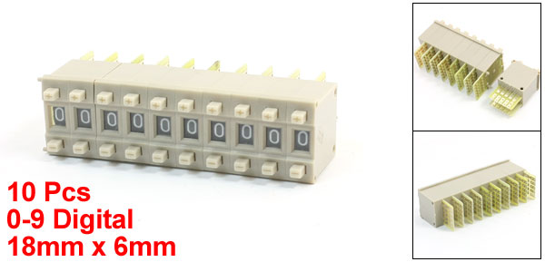 Product Name Pushwheel Switch Model KM2 Number of Unit 1 Digital 0,1,2,3,4,5,6,7,8,9 Code BCD Mounting Size(Each) 18 x 6mm/ 0.71" x 0.24"(W*T) Each Height 29mm/ 1.1" Total Length 60mm/ 2.4" Color Gray, Yellow Material Plastic, Electronic Parts Net Weight 15g Package Content 10 x Pushwheel Switches - Reviews
