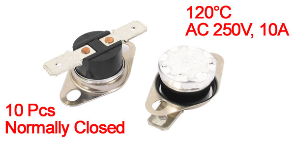 Product Name Temperature Control Switch Model.No KSD301 Action Type Normally Closed(NC) Action Temperature 120°C Voltage & Current AC 250V, 10A Total Size (Each) 34 x 18 x 12mm / 1.3" x 0.71" x 0.47"(L*W*H) Mounting Hole Size 4.5 x 3.5mm/0.18" x 0.14"(L*W) Material Metal, Plastic Color Black, Silver Tone Total Weight 47g Package Content 10 x Temperature Control Switches - Reviews