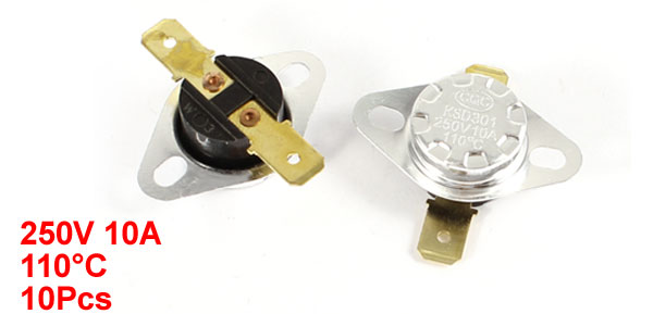 Product Name Temperature Switch Model KSD301 Action Type NC (Normal Close) Action Temperature 110C Voltage 250V 10A Size 3.3 x 3.3 x 1.1 cm / 1.3" x 1.3" x 0.4" (L*W*H) Material Metal, Plastic Color Silver Tone, Black , Gold Tone Weight 40g Package 10 x Temperature Switch - Reviews