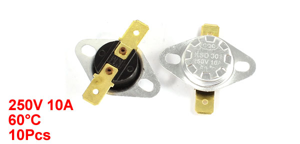 Product Name Temperature Switch Model KSD301 Action Type NC (Normal Close) Action Temperature 60C Voltage 250V 10A Size 3.3 x 3.3 x 1.1 cm / 1.3" x 1.3" x 0.4" (L*W*H) Material Metal, Plastic Color Silver Tone, Black , Gold Tone Weight 40g Package 10 x Temperature Switch - Reviews