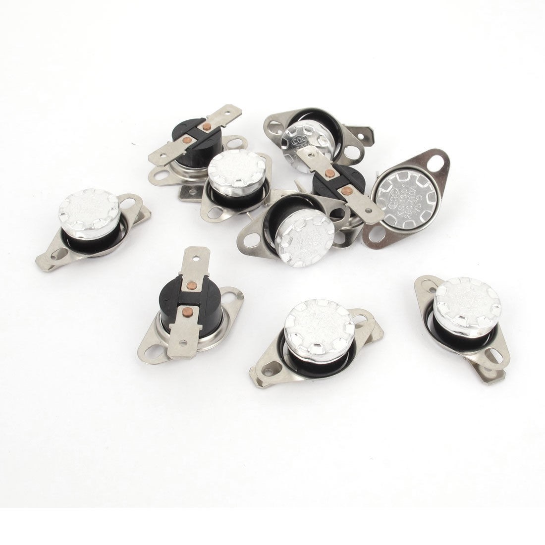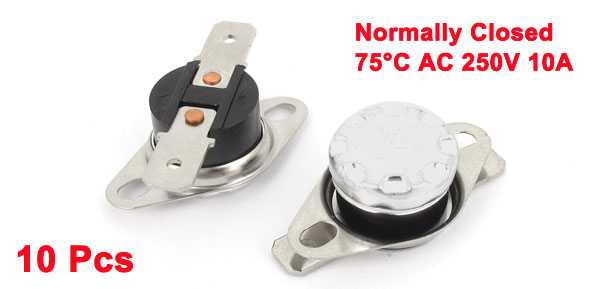 Product Name Temperature Control Switch Model.No KSD301 Action Type Normally Closed(NC) Action Temperature 75°C Voltage & Current AC 250V, 10A Total Size (Each) 34 x 18 x 12mm / 1.3" x 0.71" x 0.47"(L*W*H) Mounting Hole Size 4.5 x 3.5mm/0.18" x 0.14"(L*W) Material Metal, Plastic Color Black, Silver Tone Total Weight 47g Package Content 10 x Temperature Control Switches - Reviews