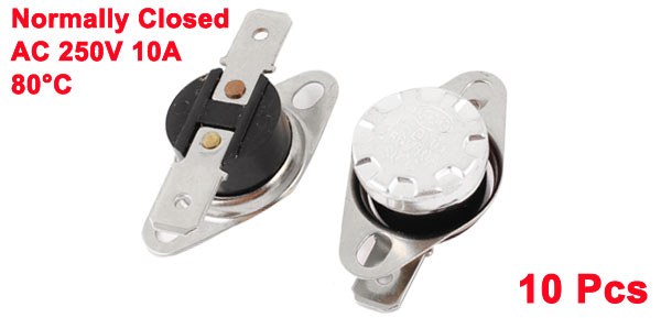 Product Name Temperature Control Switch Model.No KSD301 Action Type Normally Closed(NC) Action Temperature 80°C Voltage & Current AC 250V, 10A Total Size (Each) 34 x 18 x 12mm / 1.3" x 0.71" x 0.47"(L*W*H) Mounting Hole Size 4.5 x 3.5mm/0.18" x 0.14"(L*W) Material Metal, Plastic Color Black, Silver Tone Total Weight 47g Package Content 10 x Temperature Control Switches - Reviews