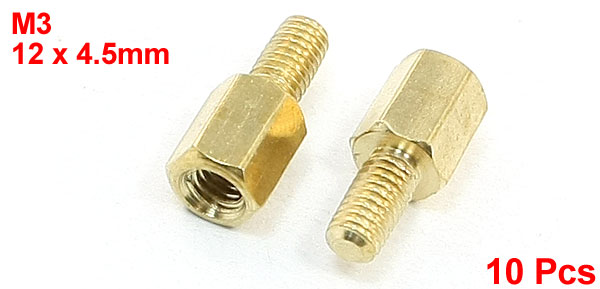 Product Name Standoff Hexagonal Spacer Thread Size M3 Male x M3 Female Male Thread Length 6mm/ 0.24" Body Length 6mm/ 0.24" Total Size(Approx.) 12 x 4.5mm/ 0.47" x 0.06" (L*Max.D) Material Brass Color Gold Tone Net Weight 10g Package Content 10 x Standoff Hexagonal Spacer