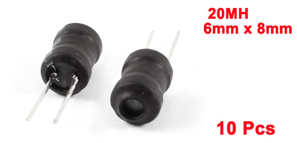 Product Name Inductor Material UL-polyolefin, Metal Inductance 20MH Body Size 6 x 8mm / 0.236" x 0.31"(D*H) Lead Diameter 0.5mm / 0.196" Pitch 3mm/ 0.118" Color Black, Silver Tone Weight 12g Package Content 10 x Inductors - Reviews