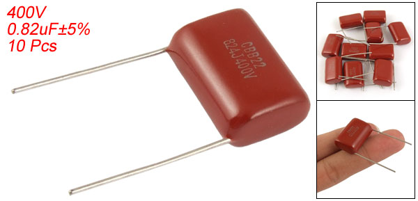 Product Name Metallized Polypropylene Film Capacitor Model CBB22 Dielectric Material Metallized Polypropylene Film Withstand Voltage 400V Capacitance 0.82uF Capacitance Tolerance ±5% Lead Spacing 19mm / 0.75" Total Size (Each) 41 x 21 x 9mm / 1.6" x 0.8" x 0.35" (L*W*T) Weight 33g Color As Picture Shown Package Content 10 x Metallized Polypropylene Film Capacitors - Reviews