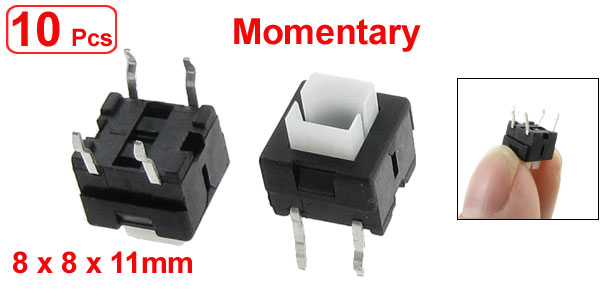 Product Name Tact Switch Contact Type Momentary Contact Pin Number 4 (Double Row) Dimension 8 x 8 x 11mm / 0.31" x 0.31" x 0.43" (L*W*H) Button Hole Dia. 4mm/ 0.16" Material Plastic, Metal, Electric Parts Color Black, Silver Tone, White Net Weight 4g Package Content 10 x Tact Switches - Reviews