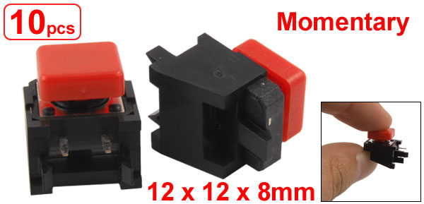 Details10 Pcs Momentary Tact Push Button Switch Right Angle 2 Pin 12 x 12mm x 8mm w Cap  Product Name Tactile Switch Action Type Momentary Switch Size 12 x 12 x 8mm / 0.47" x 0.47" x 0.3" (L*W*H) Overall Size 19 x 13 x 14mm / 0.7" x 0.5" x 0.55"(L*W*H) Cap Size 10 x 10mm / 0.39" x 0.39"(L * W) Pin Pitch 5mm / 0.19" Pin Length 4mm / 0.16" Material Plastic, Metal, Electric Parts Main Color Black, Red Net Weight 15g Package Content 10 x Momentary Tactile Switch