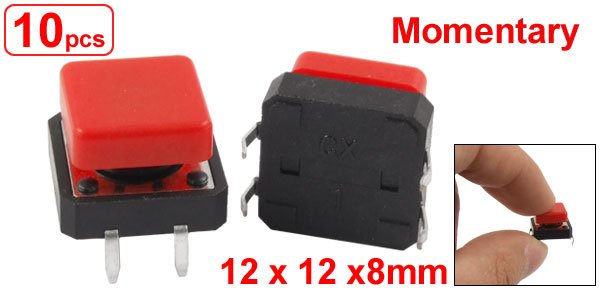 Product Name Tactile Switch Action Type Momentary Size 12 x 12 x8mm / 0.47" x 0.47" x 0.3" (L*W*H) Cap Size 10 x 10mm / 0.39" x 0.39"(L * W) Pin Pitch 13 x 5mm / 0.5" x 0.2"(L*W) Pin Length 4mm / 0.16" Material Plastic, Metal, Electric Parts Main Color Black, Red Net Weight 11g Package Content 10 x Momentary Tactile Switch - Reviews