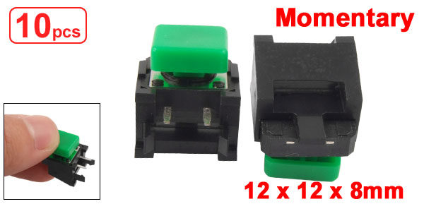 Details10 Pcs Momentary Tact Tactile Push Button Switch Right Angle 12 x 12 x 8mm w Cap  Product Name Tact Switch Contact Type Momentary Dimension 12 x 12 x 8mm/ 0.47" x 0.47" x 0.31" (L*W*H) Overall Size 18 x 13 x 17mm/ 0.7'' x 0.51'' x 0.67'' (L*W*H) Button Dia. 10mm/ 0.39" Pin Pitch 5mm/ 0.2" Pin Length 5mm/ 0.2" Material Plastic, Metal, Electric Parts Color Green, Silver Tone Net Weight 16g Package Content 10 x Tact Switches