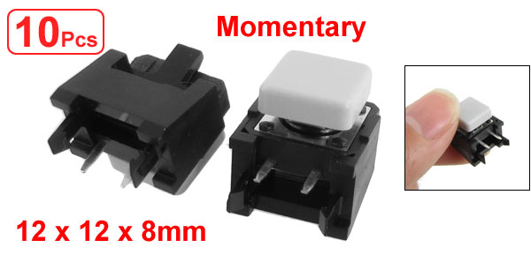 Product Name Tact Switch Contact Type Momentary Contact Switch Size(Include Cap) 12 x 12 x 8mm/ 0.47" x 0.47" x 0.31" (L*W*H) Overall Size(Include Cap) 13 x 18 x 14mm / 0.51" x 0.71" x 0.55"(L*W*H) Button Size 10 x 10 x 3mm/ 0.39" x 0.39" x 0.12"(L*W*H) Pin Pitch 5mm/ 0.2" Pin Length 4mm/ 0.16" Material Plastic, Metal, Electric Parts Color Black, Silver Tone, Grey Net Weight 16g Package Content 10 Pcs x Tact Switches - Reviews