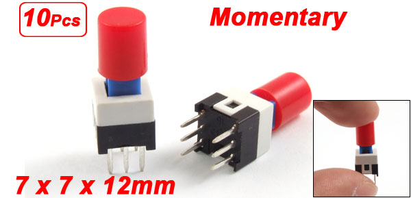Product Name Tactile Switch Contact Type Momentary Dimension 7 x 7 x 12mm / 0.27" x 0.27" x 0.47" (L*W*H) Button Cap Size 6 x 7mm / 0.23" x 0.27"(D*H) Pin Pitch 5 x 2.5mm / 0.2" x 0.098"(L*W) Pin Length 4mm / 0.16" Material Plastic, Metal, Electric Parts Color Black, White, Red Net Weight 6g Package Content 10 x Tactile Push Switch w Cap - Reviews