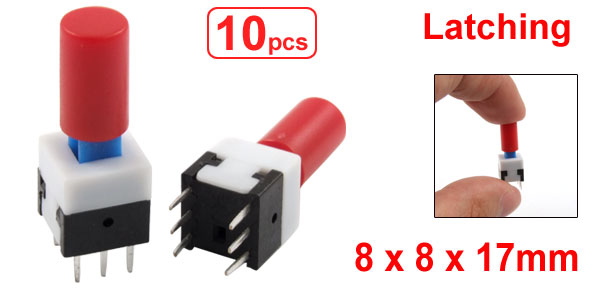 Product Name Tact Switch Contact Type Latching Dimension 8 x 8 x 17mm / 0.31" x 0.31" x 0.67" (L*W*H) Button Cap Size 5 x 10mm / 0.2" x 0.39"(D*H) Pin Pitch 6 x 2mm / 0.24" x 0.08" (L*W) Pin Length 4mm / 0.16" Material Plastic, Metal, Electric Parts Color Red, Blue, Black, White Net Weight 9g Package Content 10 x Tact Switch w Cap - Reviews